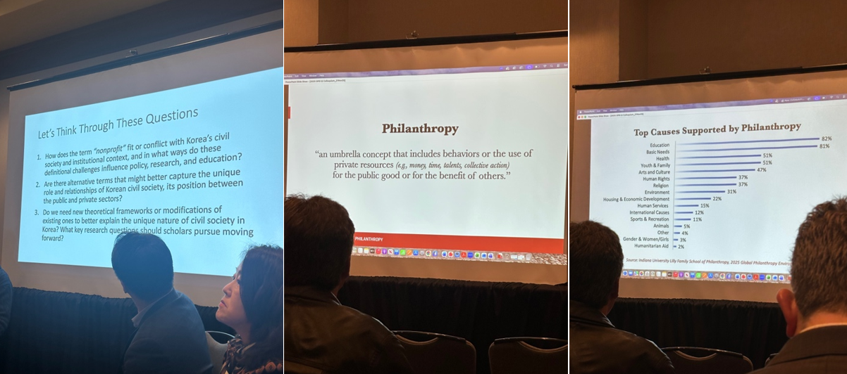 모든 세션에 다 들어가보지는 못했지만 가장 인상 깊었던 것은 한국 학자들이 ‘비영리(nonprofit)’ 라는 용어를 문화적 국가적 맥락에 따라 정의해야 한다는 토론이었다. 미국에서 시작하여 전세계적으로 “비영리”라는 용어를 쓰지만, 한국만 하더라도 공익단체, 비영리단체, 시민단체 등 다양한 용어들이 존재한다. 각 지역이나 문화에 따른 용어들에 대해서도 한 번 다시 고민해볼 수 있는 뜻깊은 시간이었다. 그리고 필란트로피란 사적 자원(돈, 시간, 재능)을 가지고 공공을 위해 또는 다른 사람의 이익을 위해 기꺼이 자발적으로 행동하는 것을 의미한다. 다시 한 번 필란트로피의 개념에 대해서 상기시킬 수 있었고, 필란트로피로 지원되는 사업은 교육(82%), 기본 욕구(81%), 건강(51%), 청소년 및 가족(51%), 문화예술(47%) 등 순이었다. 필란트로피에 대해 조금 더 구체적으로 이해할 수 있는 시간이었다.