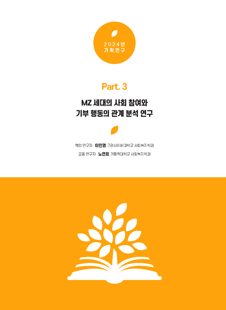 MZ 세대가 사회 참여와 기부를 어떻게 연결하고 있는지를 실증적으로 살펴본 ‘기획연구 2024 : MZ세대의 사회 참여와 기부 행동의 관계 분석 연구’를 통해 기부참여방식의 변화에 대해 살펴볼 수 있습니다. 연구 결과, MZ세대의 기부는 정기적·조직 중심 기부보다는 이슈와 참여를 기반으로 한 기부, 금액 중심 참여보다는 경험과 맥락을 중시하는 참여, 기부 단독 행위보다는 자원봉사·캠페인·온라인 참여와 연결된 기부로 점차 이동하고 있는 모습이 확인됩니다. 연구보고서는 아래 링크를 통해 다운로드받으실 수 있습니다.