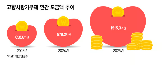 고향사랑기부제는 지역 간 불균형 해소와 지방재정 확충을 목표로 도입된 제도이다. 일본의 ‘고향납세’ 사례를 참고했지만, 국내 제도는 ‘세금’이 아닌 ‘기부’를 기반으로 설계되었다는 점에서 운영 방식과 제도적 성격에 차이가 있다. 제도 도입 초기에는 플랫폼의 정착, 답례품의 한계, 지자체별 격차 등의 한계에도 불구하고 고향사랑기부제를 통한 기부금액은 지속적으로 증가하고 있다. 행정안전부 자료에 따르면 고향사랑기부제 모금액과 모금 건수는 ’23년 651억 원(52.6만 건)에서 ’24년 879억 원(77.4만 건), ’25년 1,515억 원(139.2만 건)으로 매년 증가했다. 이 같은 증가 추세는 제도가 ‘비수도권 지방정부로의 기부’ 흐름과 맞물려 작동하고 있음을 보여주는 지표로도 해석된다.