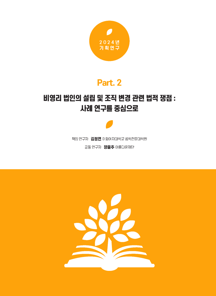 비영리법인 설립을 둘러싼 논의는 제도 차원의 원칙과 실제 현장에서 겪는 경험 사이의 간극을 함께 살펴볼 때 더 선명해집니다. 기획연구2024:비영리법인의 설립 및 조직 변경 관련 법적 연구는 비영리법인의 설립과 분할·전환 과정에 직접 참여한 당사자와 자문가 6인의 심층 인터뷰를 바탕으로, 허가주의 구조 속에서 발생하는 실제 쟁점들을 정리했습니다. 설립 과정에서 요구되는 ‘기본재산’의 의미와 현실적 부담, 주무관청별 기준 차이와 절차 지연 문제, 영리법인에서 비영리법인으로의 ‘전환’이 제도적으로 보장되지 않는 한계, 비영리법인 분할의 법적 근거 부재와 그로 인한 불안정성 등 비영리법인 설립 및 조직변경제도의 구조적 쟁점을 보다 구체적인 사례를 통해 확인해볼 수 있습니다.