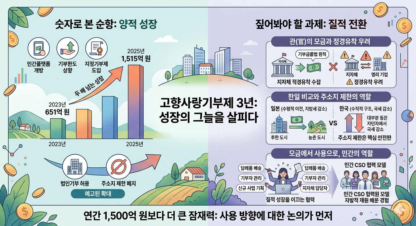 고향사랑기부제가 시행 3년을 맞으며 빠르게 성장하고 있습니다. 모금액은 2023년 651억 원에서 2025년 1,515억 원으로 두 배 이상 증가했고, 민간 플랫폼 개방과 기부 한도 상향 등 제도 개선도 이어지고 있습니다.
