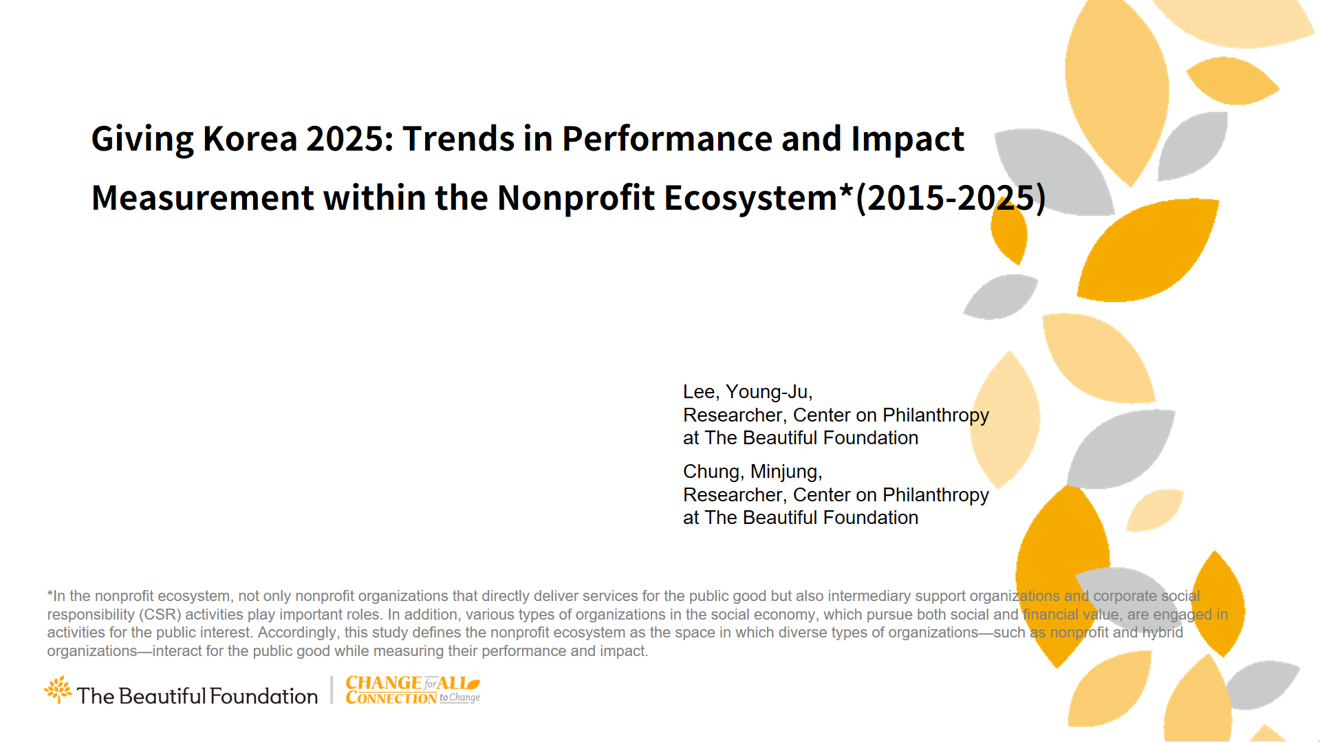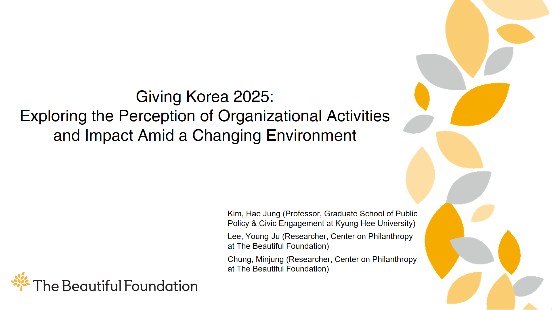 Center on Philanthropy at The Beautiful Foundation contributes to the promotion of philanthropy in Korea through Giving Korea. It investigates and reports on donation behaviors and perceptions. The individual giving survey began in 2001 and has been conducted biennially since then.